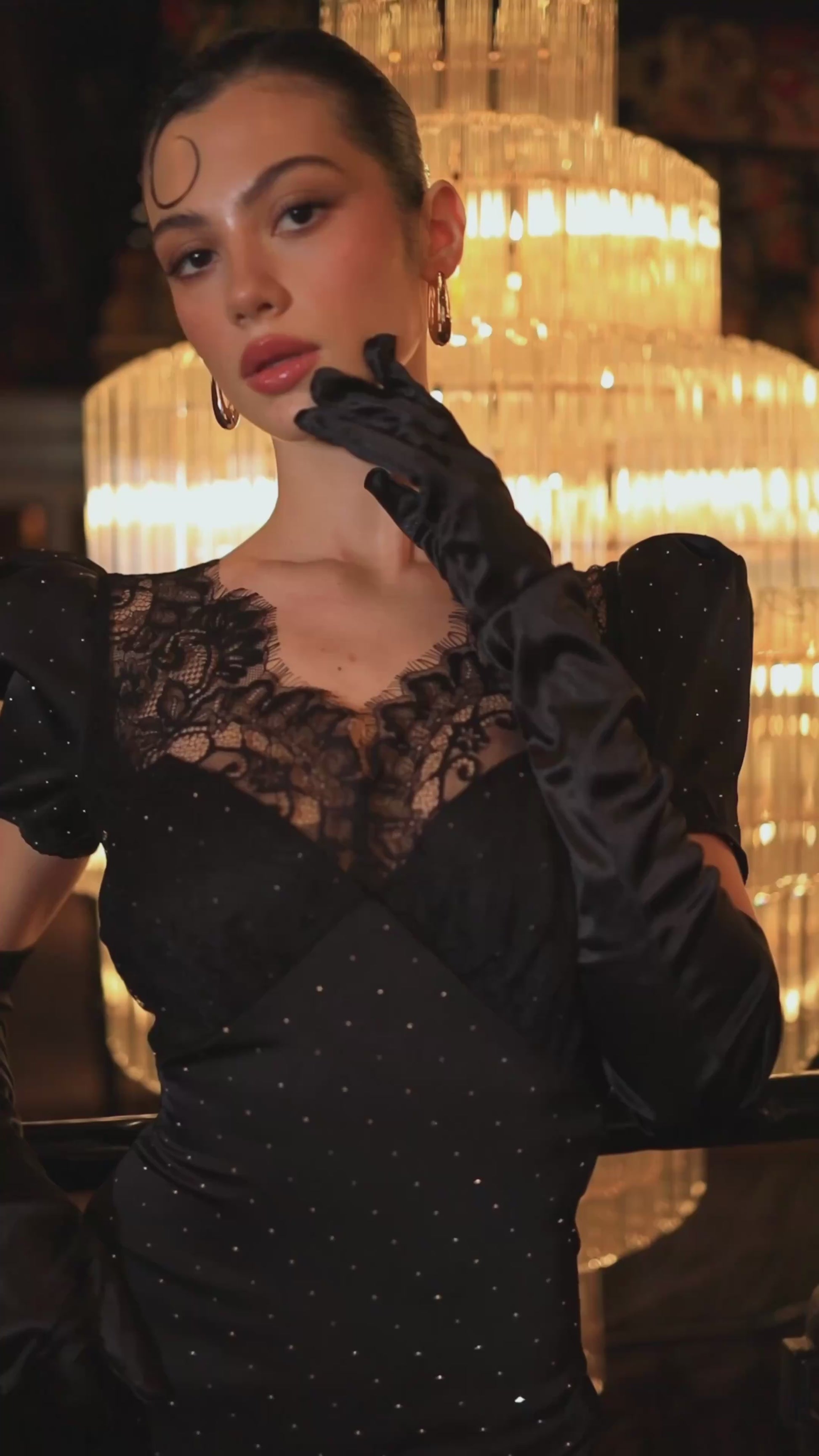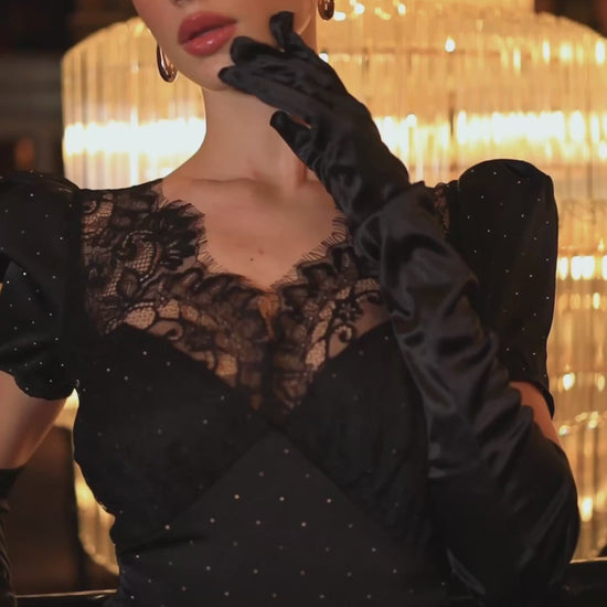 Сукня максі, виконана з атласу з камінчиками та французького мережива.
